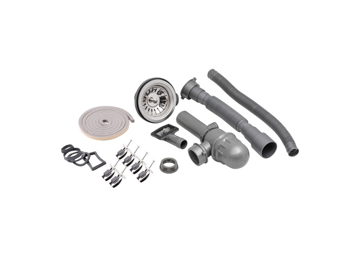 Мойка, сифон, слив/перелив, корзинчатый вентиль, уплотнительная лента, крепежи.