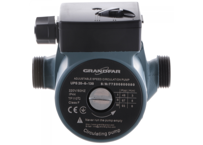 Насос циркуляционный центробежный GRANDFAR UPS20-6-130 (обмотка-медь) (с накидными гайками) (GF1058) предназначен для циркуляции воды в отопительных системах, местных системах горячего водоснабжения, а также в системах кондиционирования воздуха и охлаждения. Насосы применяются главным образом для одно- или двухтрубных систем отопления, систем теплых полов, но могут также использоваться в смесительных контурах больших систем.