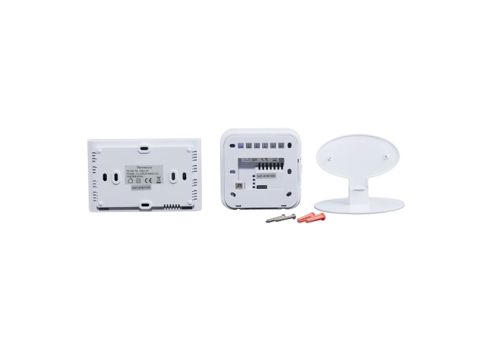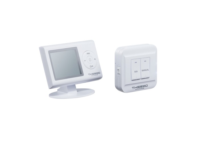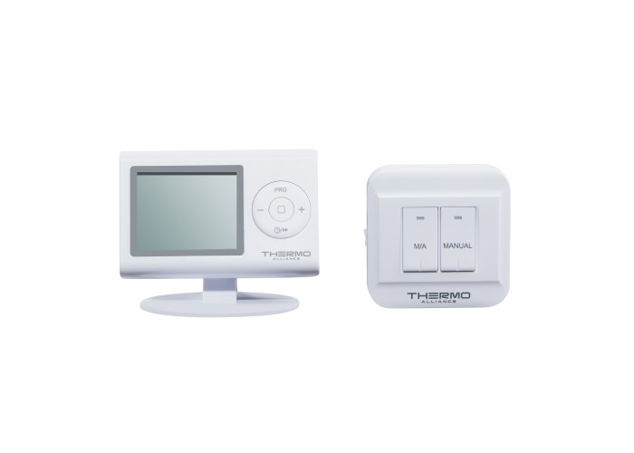 Недельный программируемый термостат Thermo Alliance ТА-2402RF имеет два блока: блок управления отопительным прибором (включение/отключение) и блок комнатного термостата, он используется в качестве графического интерфейса пользователя для определения и контроля температуры в помещении. Оба блока поддерживают связь радиочастотами (RF).
